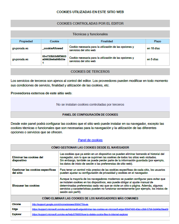- Cookies propias: Son aquellas que se envían al equipo terminal del usuario desde un equipo o dominio gestionado por el propio editor y desde el que se presta el servicio solicitado por el usuario.